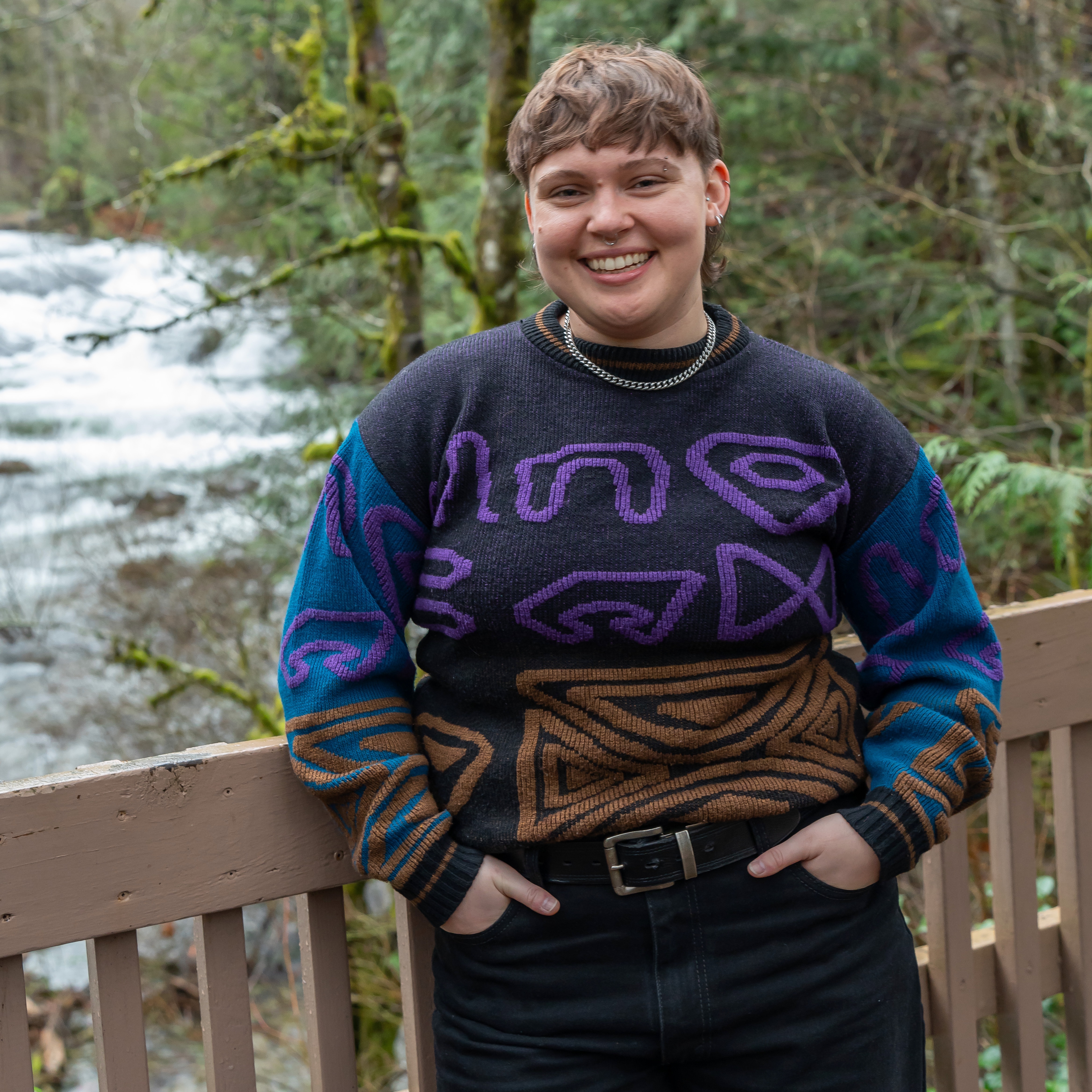Esther Solomon is a multimedia visual artist who focuses on themes of joy, longing, and belonging. They love taking trash and making it more beautiful trash for friends and community to enjoy.